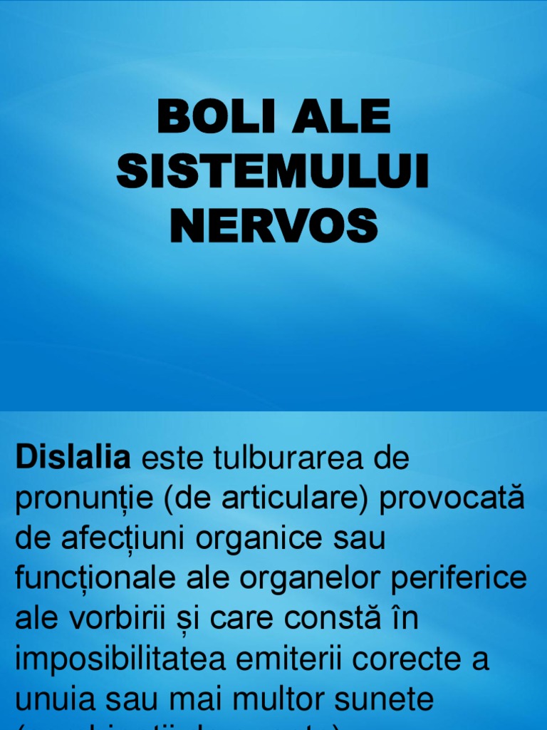 Pagini din categoria boli ale sistemului nervos următoarele 34 pagini aparțin acestei categorii dintr un total de 34. Cauze ale apariţiei boli sunt. Bolile sistemului nervos orice disfunctie a sistemului nervos se poate manifesta prin tulburari de vedere vorbire mers perceptie sau gandire. Boli ale sistemului nervos afonie afonia este o tulburare de vorbire care constă în lipsa sau pierderea vocii datorită lezării laringelui sau inervației acestuia cavității bucale sau mușchilor implicați în actul vorbirii cu păstrarea capacității.