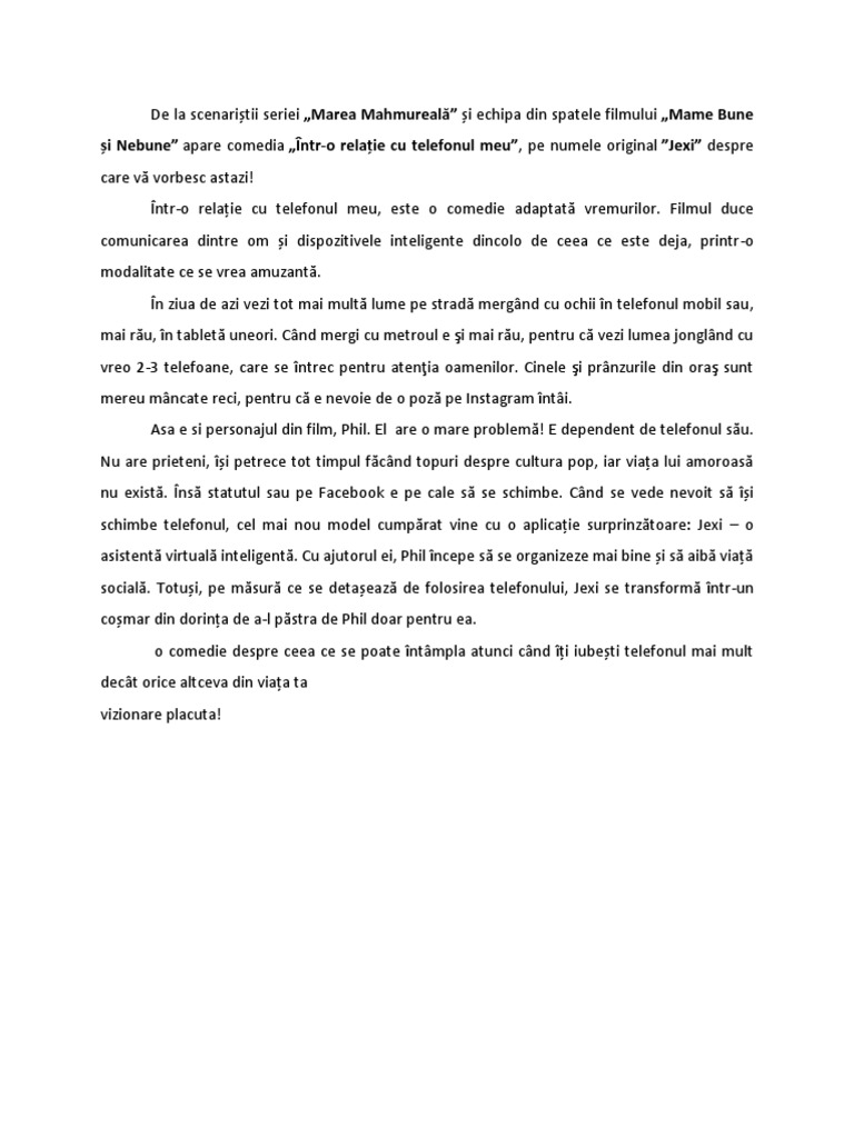 Program meniu acasa concurs intrebari frecvente tarife informatii termeni si conditii protectia datelor. E dependent de telefonul său. Phil are o mare problemă. Filmul într o relație cu telefonul meu duce comunicarea dintre om și dispozitivele inteligente dincolo de ceea ce este deja printr o modalitate ce se vrea amuzantă.