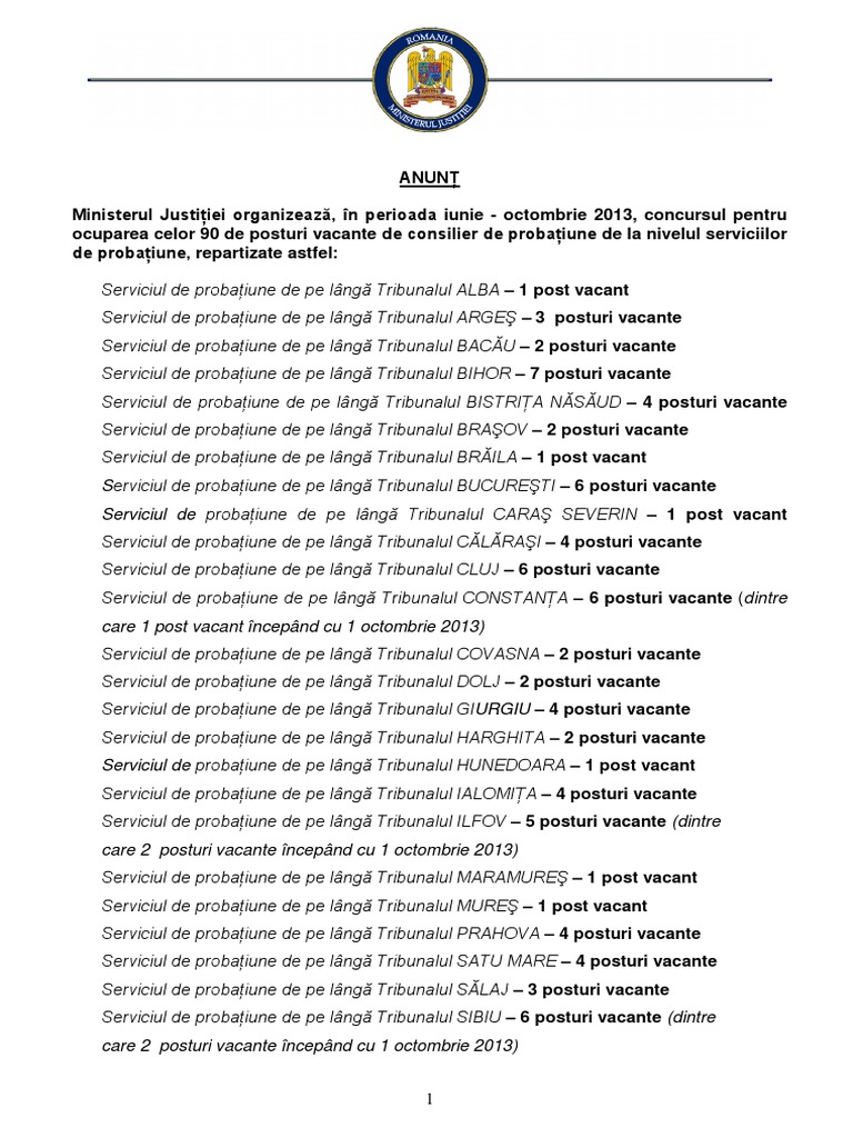 Ministerul justitiei posturi vacante posturi vacante direcția națională de probațiune anunță declanșarea unei proceduri de transfer la cerere pentru ocuparea unui număr de 5 posturi de funcționar public și 1 post personal admin 2.