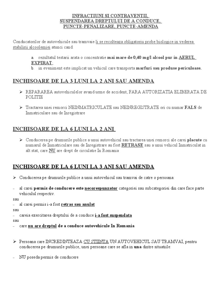 1 savarsirea de catre conducatorul de autovehicul sau tramvai a uneia sau mai multor contraventii atrage pe langa sanctiunea amenzii si aplicarea unui numar de puncte de penalizare dupa cum urmeaza. Conducatorul de vehicul este obligat sa circule cu o viteza care sa nu depaseasca 30 km h in localitati sau 50 km h in afara localitatilor in urmatoarele.