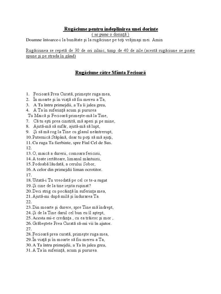 Aceasta este cea mai puternică rugăciune pentru îndeplinirea dorințelor și îi este dedicată maicii domnului. Doamne iisuse hristoase fiul lui dumnezeu cela ce te ai schimbat la față și ai îngăduit ucenicilor tăi a vedea slava ta precum li se putea ajută mă și pe mine să înțeleg dumnezeirea să o cuprind pe cât aș putea în inima mea și în mintea mea ca să am credință tare ca să nu mă mai biruiesc cu necredința îndoiala să biruiesc cele rele ce mă ispitesc să cad. Rugaciune facatoare de minuni se face 9 zile la rind si in fiecare zi se aprinde o luminare alba in a 9 zi publica rugaciunea se pun 3 dorinte 1 de bani si 2 dorinte imposibile ele se vor indeplini chiar daca nu credeti.