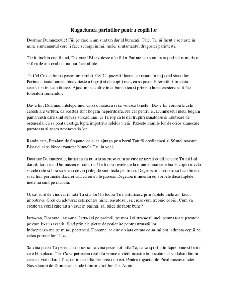 Rugaciunea parintilor pentru copii lor. Rugăciune către sfântul mare mucenic mina pentru ajutor la găsirea lucrurilor pierdute rugăciunea părinților pentru copii rugăciunea părinților pentru luminarea minţii copilului rugăciune de lăsare în voia lui dumnezeu şi a maicii. Rugaciunea parintilor pentru fiii lor doamne dumnezeul cerului si al pamantului care cu intelepciunea ta ai zidit pe om din tarana si ai suflat in fata lui suflare de viata facandu l. Dumnezeule parinte ceresc multindurat miluieste pe co piii nostri numele pentru care te ru gam cu smerenie si pe care ii lasam intr adins ocrotirii tale. Sfinte efrem ocrotitorule al părinţilor binecredincioşi şi al copiilor lor auzi rugăciunea noastră şi sârguieşte te să ne vii în ajutor.