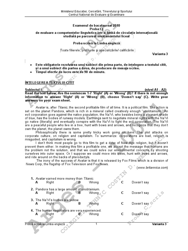 Variantele modelele de subiecte precum și baremele de evaluare şi de notare elaborate în coordonarea centrului național de evaluare și examinare pentru toate evaluările examenele şi concursurile naționale nu pot fi preluate în.
