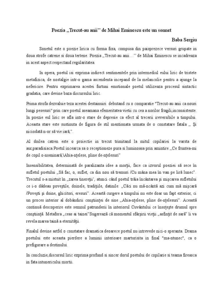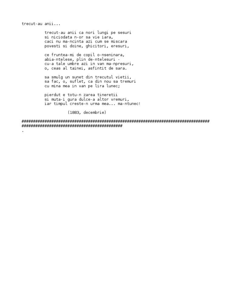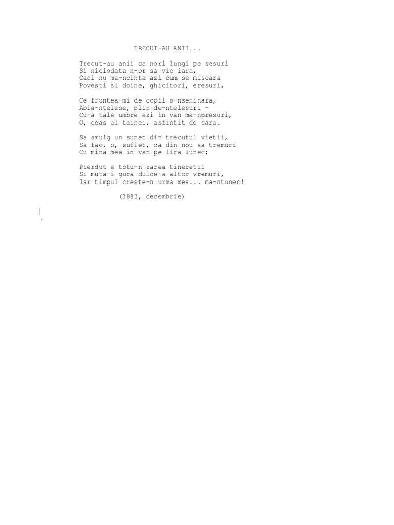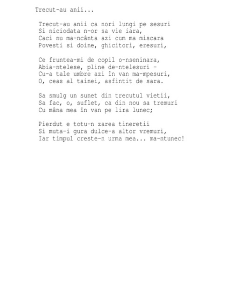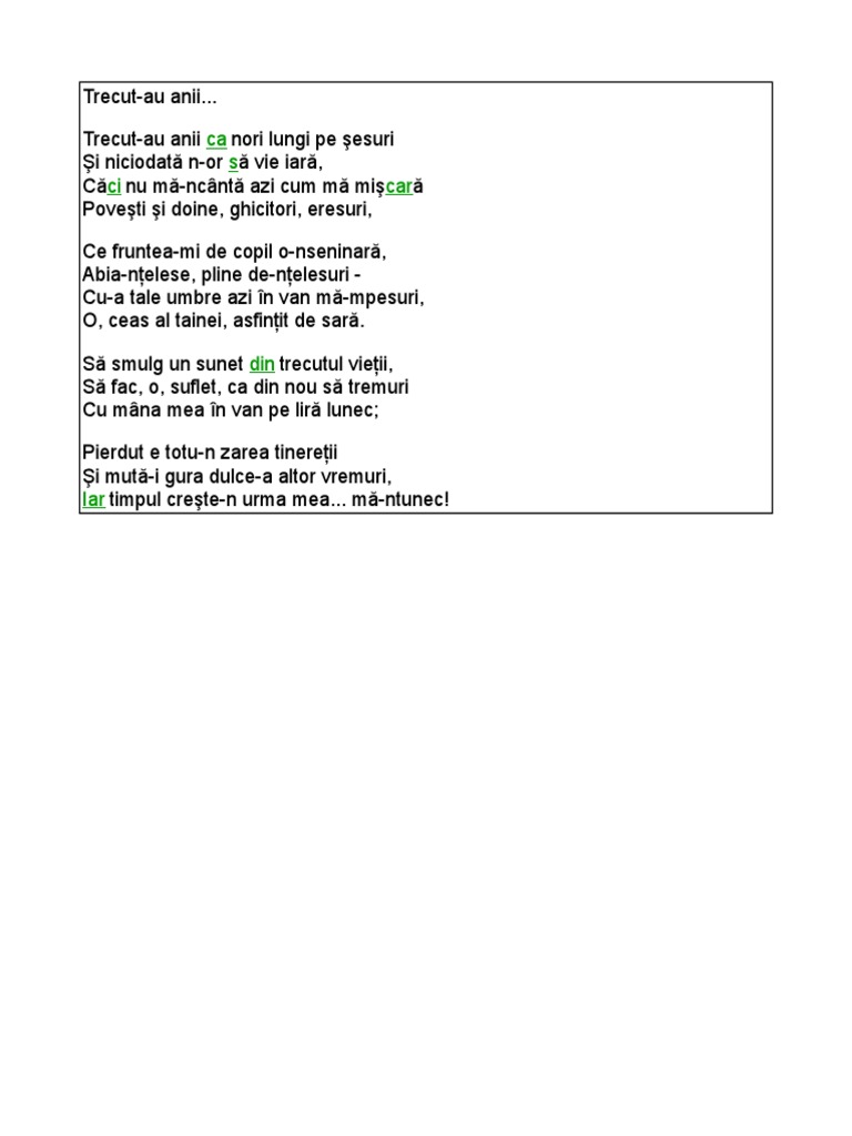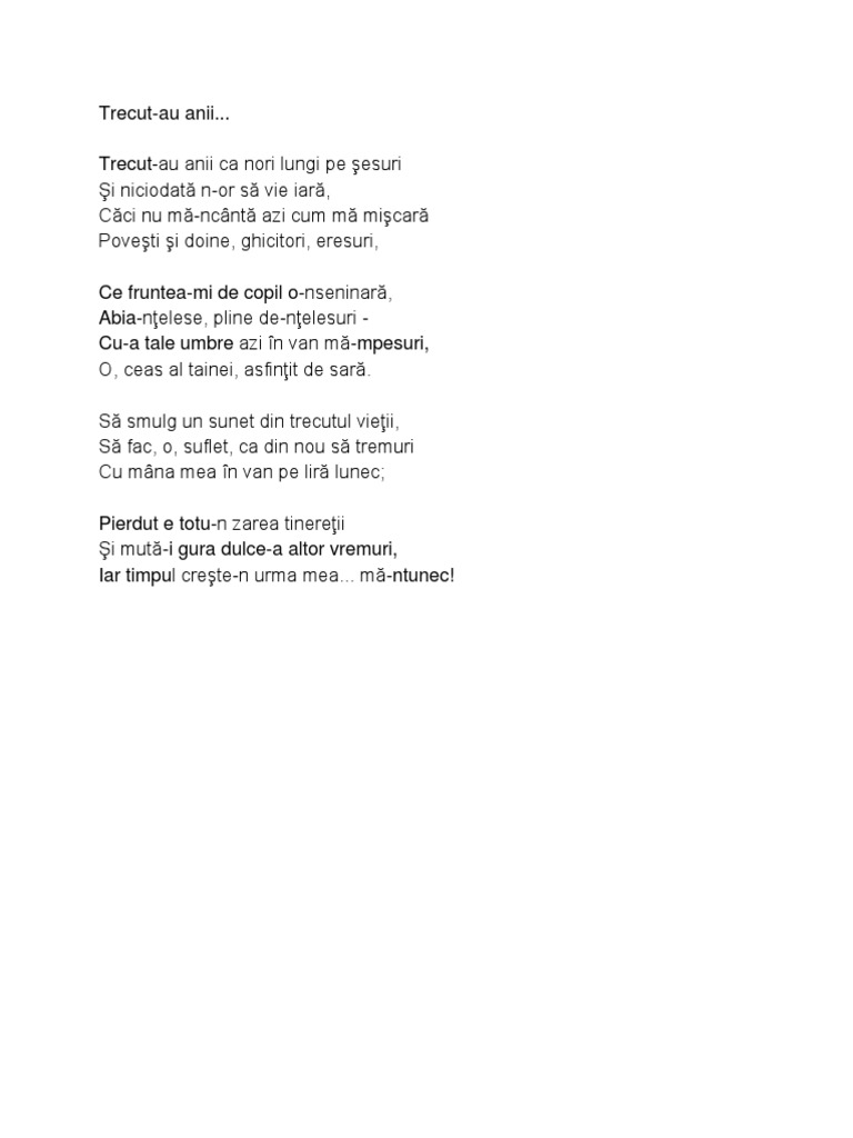 Trecut au anii. Trecut au anii ca nori lungi pe sesuri si niciodatã n or sã vie iarã cãci nu mã ncîntã azi cum mã miscarã povesti si doine ghicitori eresuri ce fruntea mi de copil o nseninarã abia ntelese pline de ntelesuri cu a tale umbre azi. Trecut au anii ca nori lungi pe şesuri şi niciodată n or să vie iară căci nu mă ncântă azi cum mă mişcară poveşti şi doine ghicitori eresuri ce fruntea mi de copil o nseninară abia nţelese pline de nţelesuri cu a tale umbre azi în. Dă clic pentru a partaja pe facebook se deschide în fereastră nouă dă clic pentru a partaja pe. Dragă cititor al forumului nostru dacă dorești să participi activ la discuțiile purtate ai întrebări sau vrei să deschizi alte teme este necesar să te.